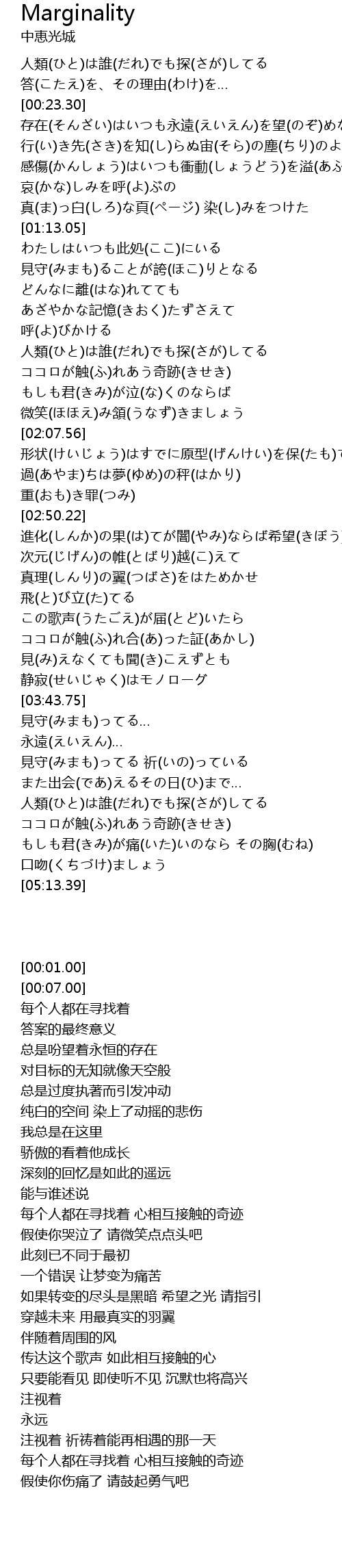 | [05:05.92] | 人類(ひと)は誰(だれ)でも探(さが)してる ココロが触(ふ)れあう奇跡(きせき) |