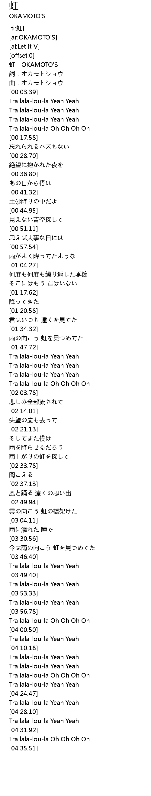 | [00:00.40] | 虹 - OKAMOTO'S |