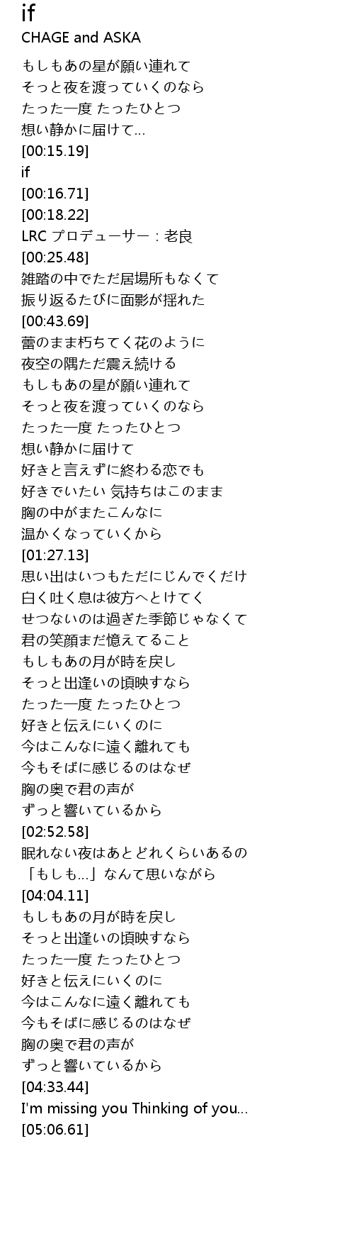 | [05:02.37] | I'm missing you Thinking of you… |