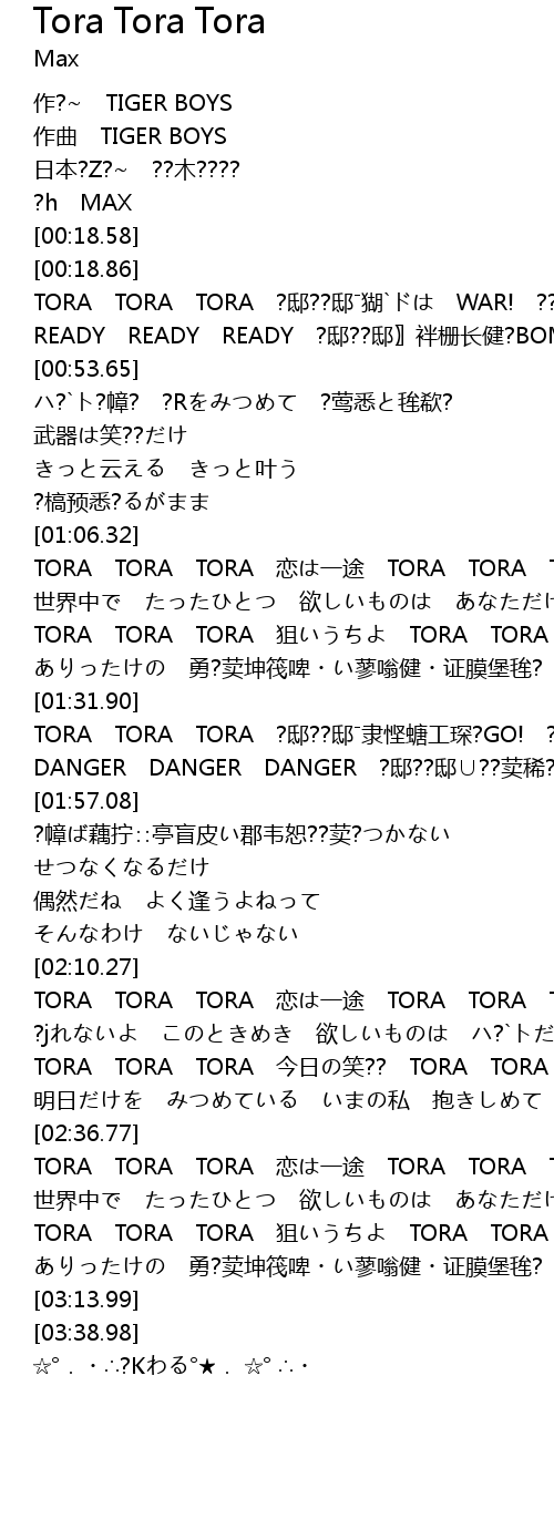 | [03:01.29] | TORA TORA TORA 狙いうちよ TORA TORA TORA ?儇?よ |