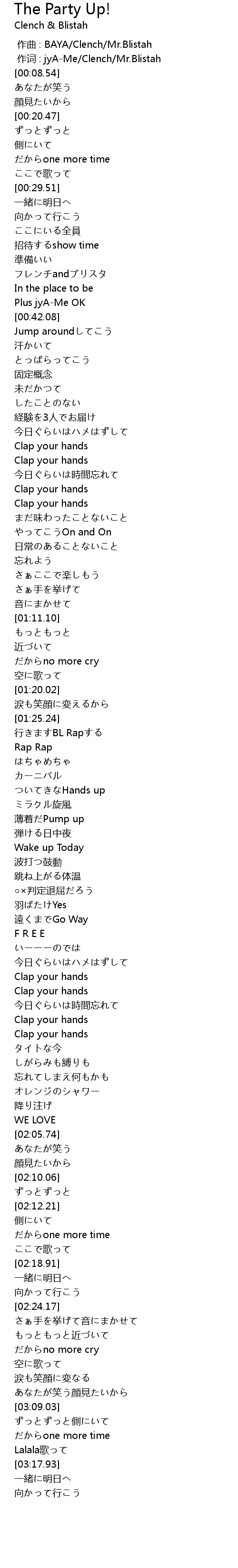 | [00:01.00] | 作词 : jyA-Me/Clench/Mr.Blistah |