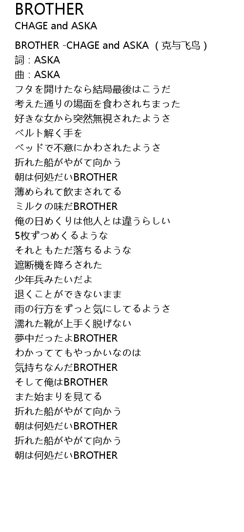 | [00:00.00] | BROTHER -CHAGE and ASKA (克与飞鸟) |