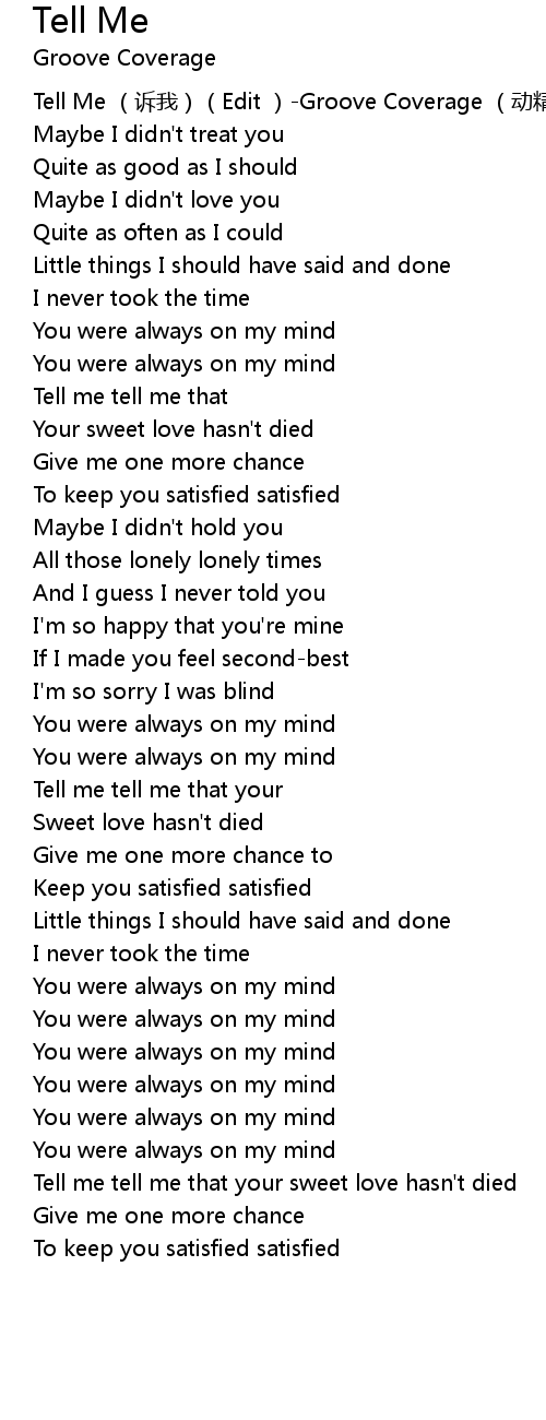 | [00:00.00] | Tell Me sù wǒ Edit Groove Coverage dòng jīng líng yuè tuán |