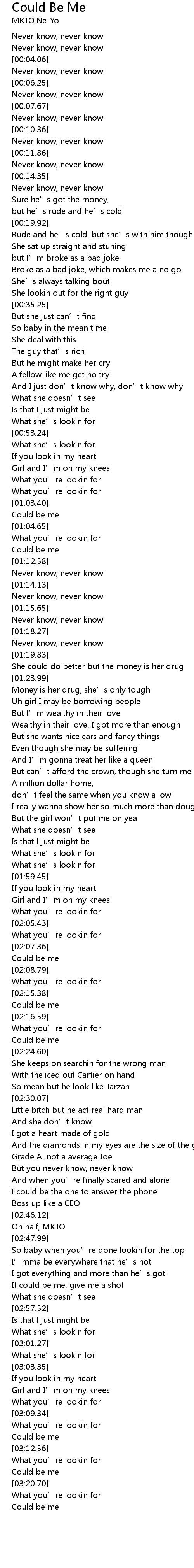 | [01:03.95] | Could be me |