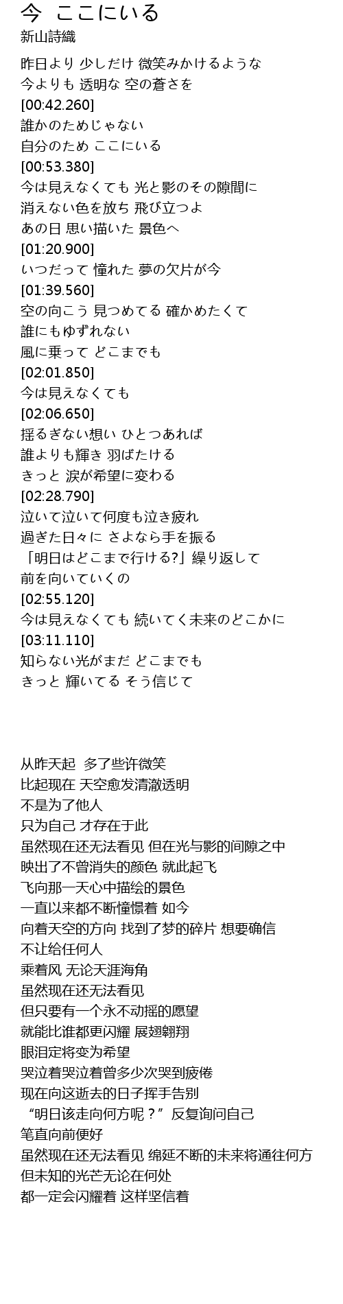 | [01:41.180] | 空の向こう 見つめてる 確かめたくて |