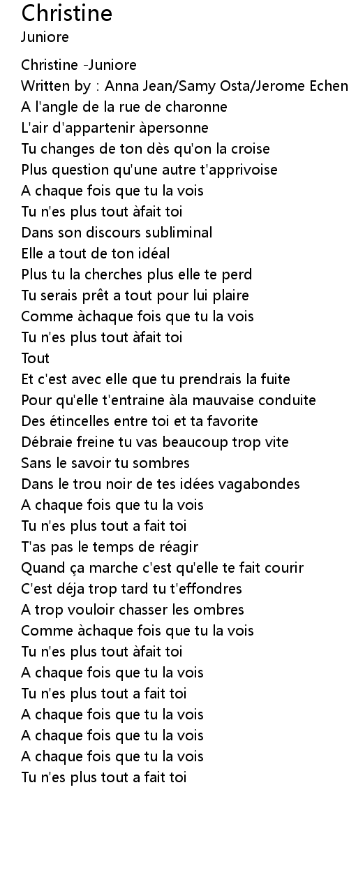 | [02:11.444] | Tu n' es plus tout a fait toi |