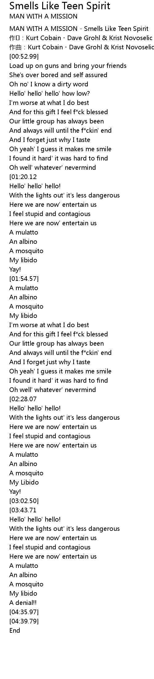 | [00:00.00] | MAN WITH A MISSION Smells Like Teen Spirit |