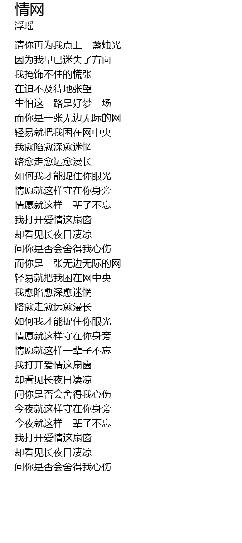 | [01:17.76] | ér nǐ shì yī zhāng wú biān wú jì de wǎng |