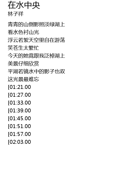 | [02:33.00][01:21.00] | zài shuǐ zhōng yāng yǒu lì yǐng yī shuāng fǎng sì huà zài hú shàng |