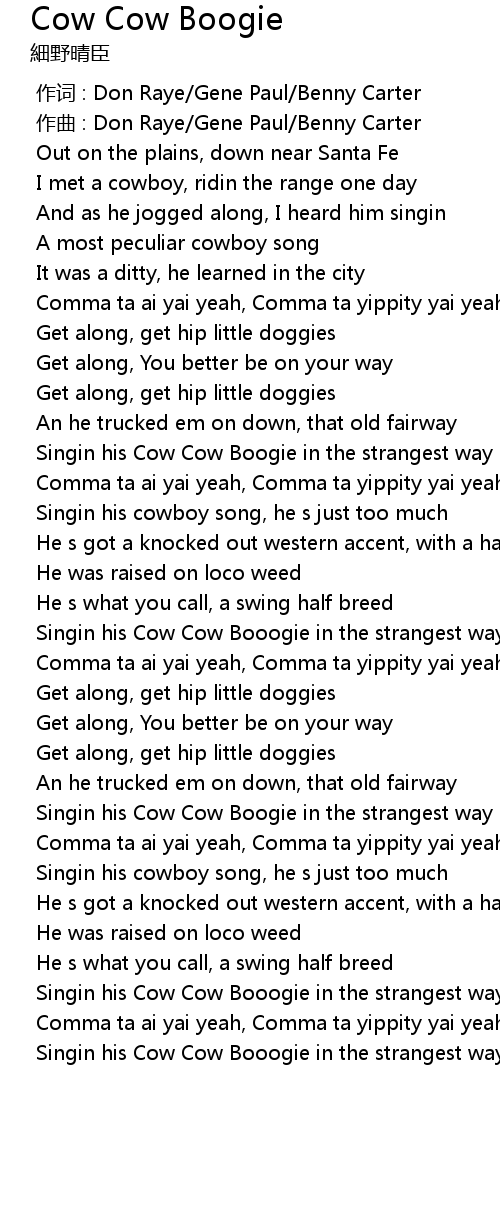 | [02:32.762] | Singin his Cow Cow Booogie in the strangest way |
