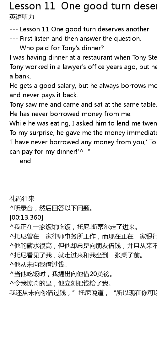| [00:00.800] | Lesson 11 One good turn deserves another |