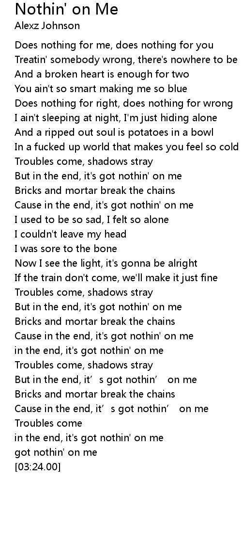 | [01:12.98] | Cause in the end, it's got nothin' on me |