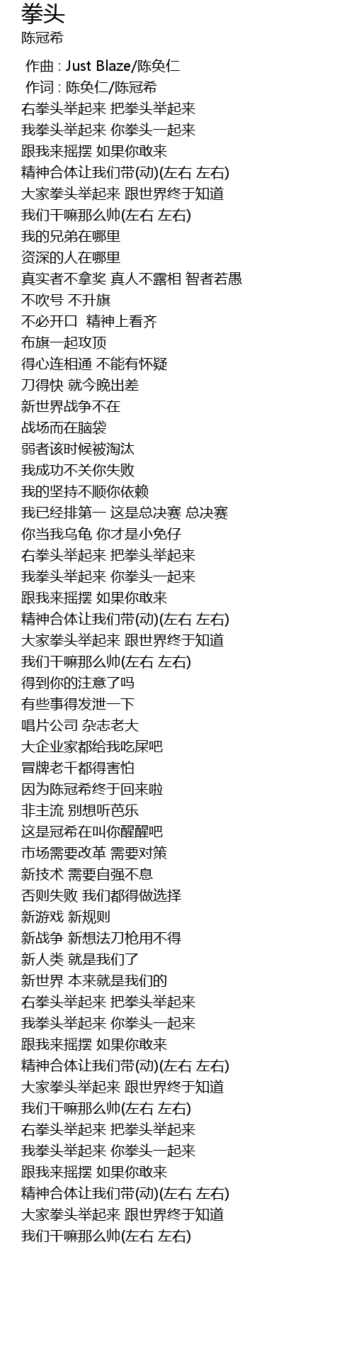 | [00:25.350] | 我拳头举起来 你拳头一起来 |