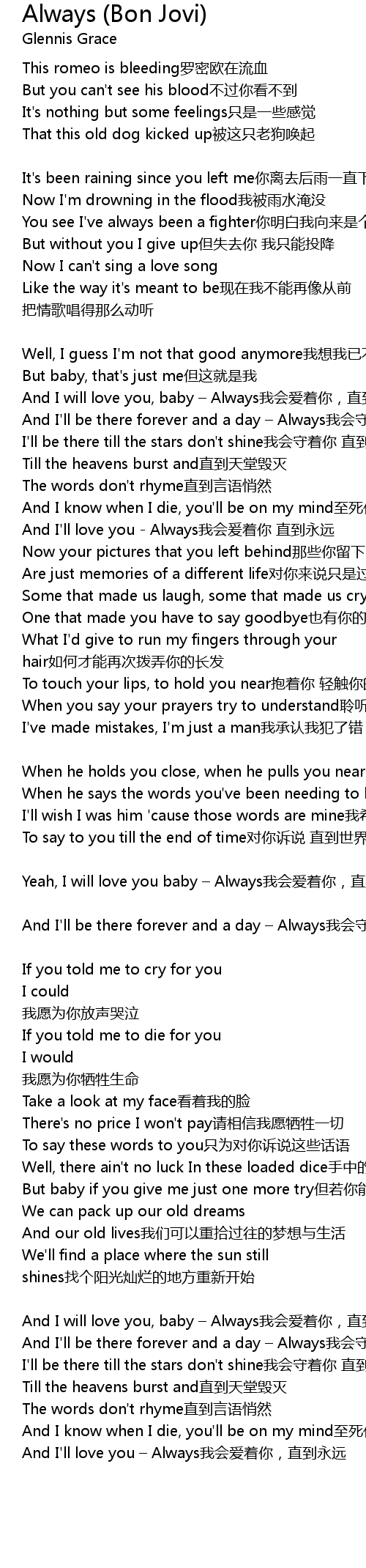 | And I' ll be there forever and a day Always wǒ huì shǒu zhe nǐ zhí dào hǎi kū shí làn | |