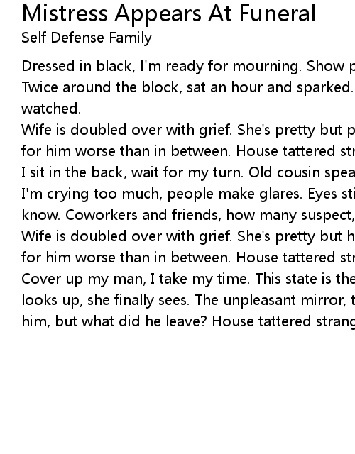Dressed in black, I'm ready for mourning. Show people back to keep it sporty. Twice around the block, sat an hour and sparked. Doors creaked open and everyone watched. |