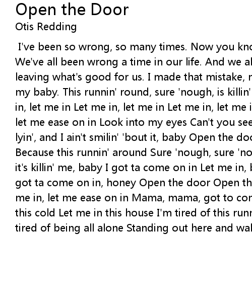 [spoken] I've been so wrong, so many times. Now you know what I'm talkin' about. We've all been wrong a time in our life. And we all make mistakes sometimes of leaving what's good for us. I made that mistake, now I'm tryin' to get back to my baby. This runnin' round, sure 'nough, is killin' me Let me, let me in Let me in, let me in Let me in, let me in Let me in, let me in, let me in, let me in, let me ease on in Look into my eyes Can't you see I got to come on in I ain't lyin', and I ain't smilin' 'bout it, baby Open the door or I'm bustin' in Because this runnin' around Sure 'nough, sure 'nough, is killin' me Let me in, it's killin' me, baby I got ta come on in Let me in, baby, please let me in I got ta come on in, honey Open the door Open the door Let me in, let me in, let me in, let me ease on in Mama, mama, got to come in Open the door I can't stand this cold Let me in this house I'm tired of this runnin' around Tired of being, tired of being all alone Standing out here and walkin' with, walkin' with [fade] |