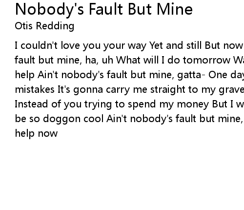 | I couldn't love you your way Yet and still But now I miss you Ain't nobody's fault but mine, ha, uh What will I do tomorrow Wallow But crying ain't gonna help Ain't nobody's fault but mine, gatta- One day, I've gotta pay for my mistakes It's gonna carry me straight to my grave I wanna tell ya somethin', uh Instead of you trying to spend my money But I was just a doggone fool Trying to be so doggon cool Ain't nobody's fault but mine, ha, uh I need a little bit of help now |