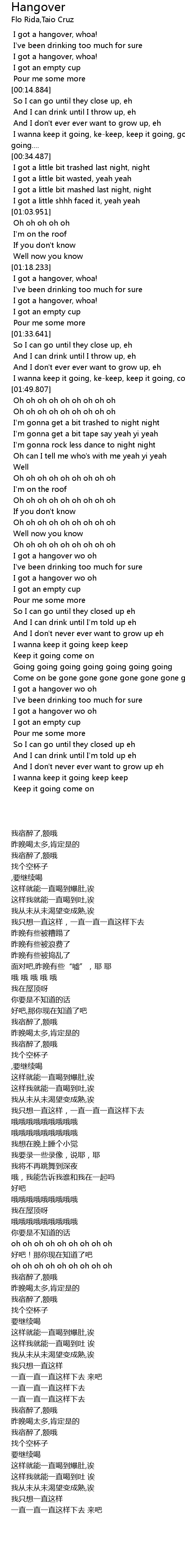 | [00:00.393] | I got a hangover, whoa! |