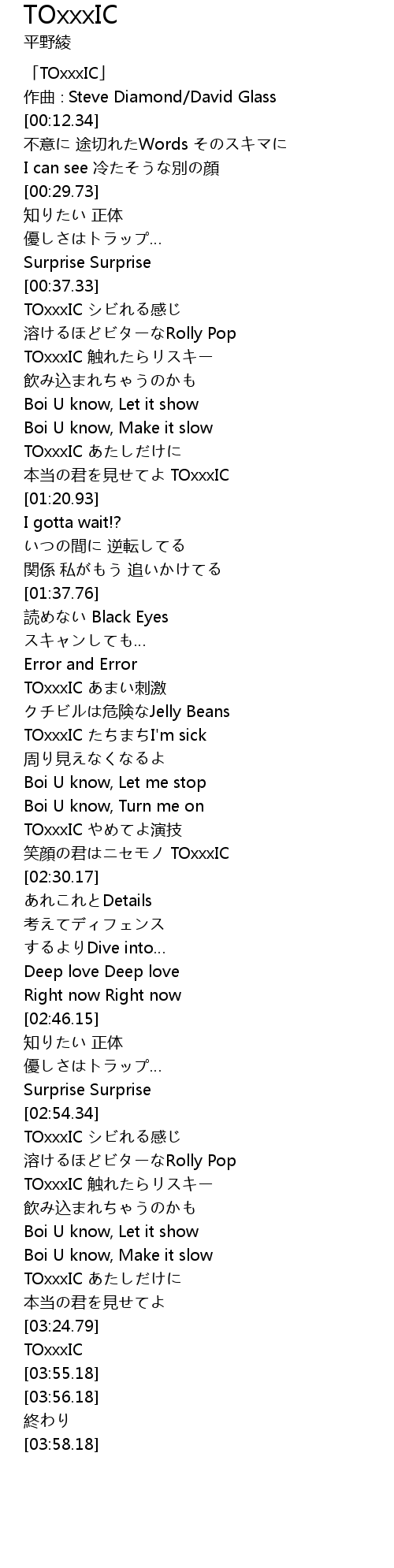 | [03:03.42] | TOxxxIC 触れたらリスキー |