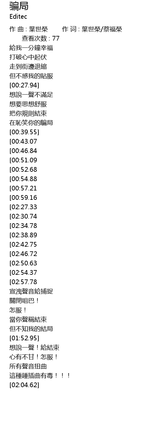 | [00:03.21] | zuo qu : ye shi rong zuo ci : ye shi rong cai fu rong zha kan ci shu : 77 |