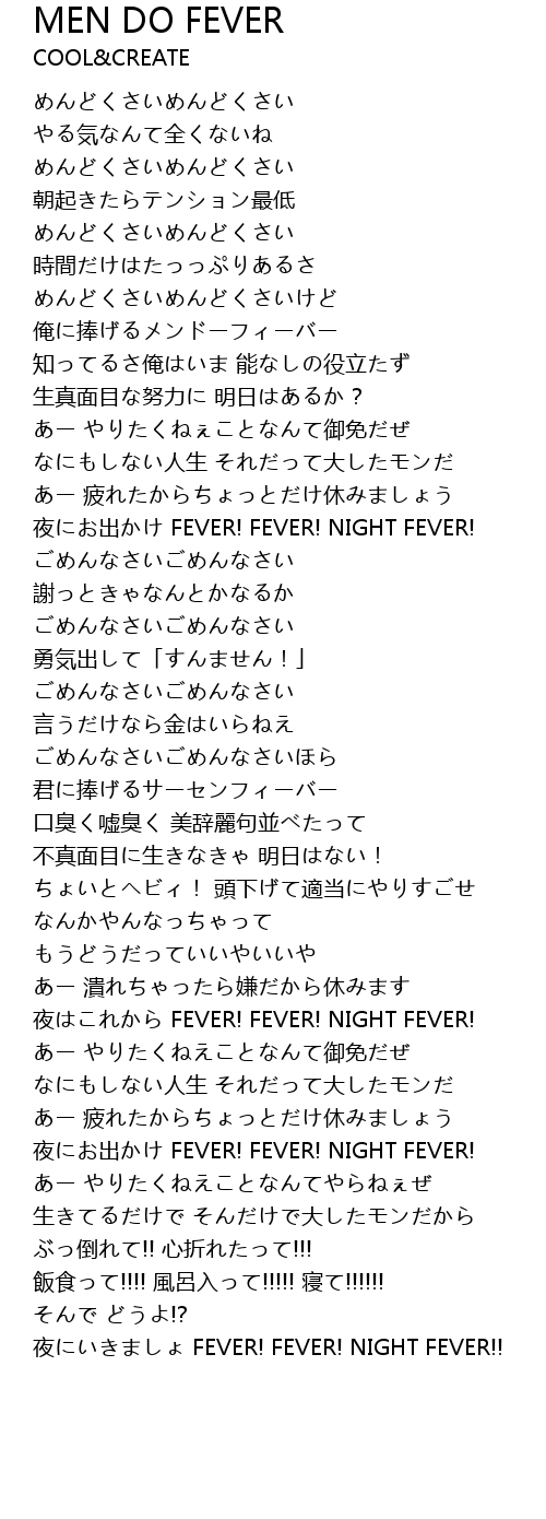 | [00:33.910] | めんどくさいめんどくさいけど 俺に捧げるメンドーフィーバー |