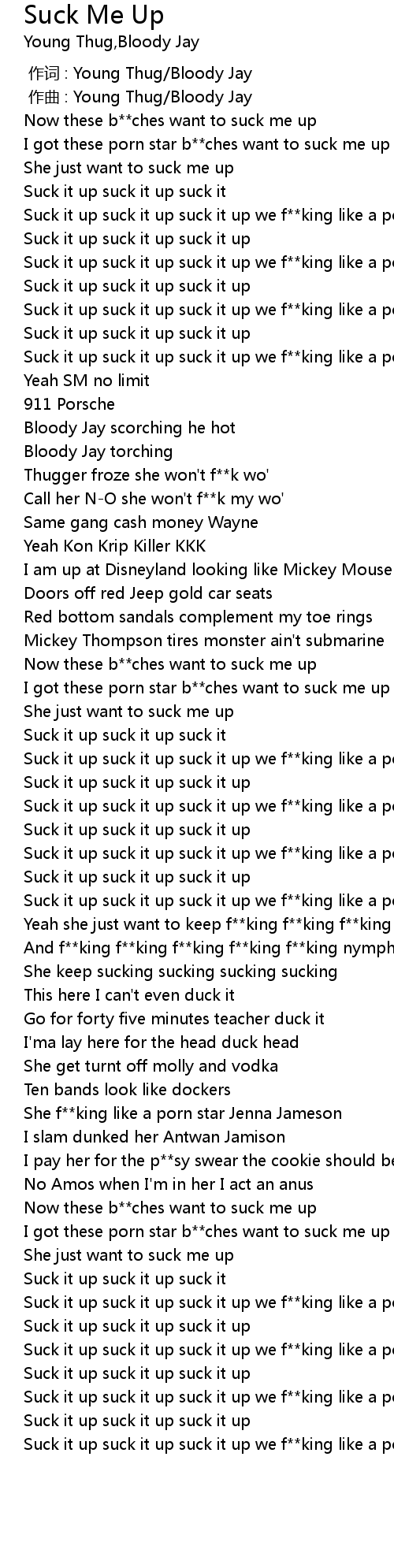 | [01:49.15] | Suck it up suck it up suck it up we f**king like a porno movie |
