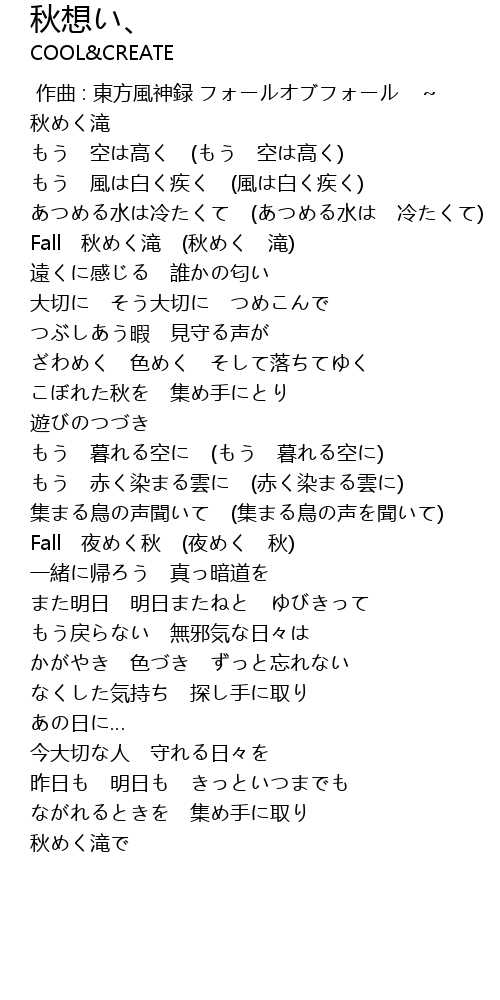 | [00:00.00] | 作曲 : 東方風神録 フォールオブフォール ~ 秋めく滝 |