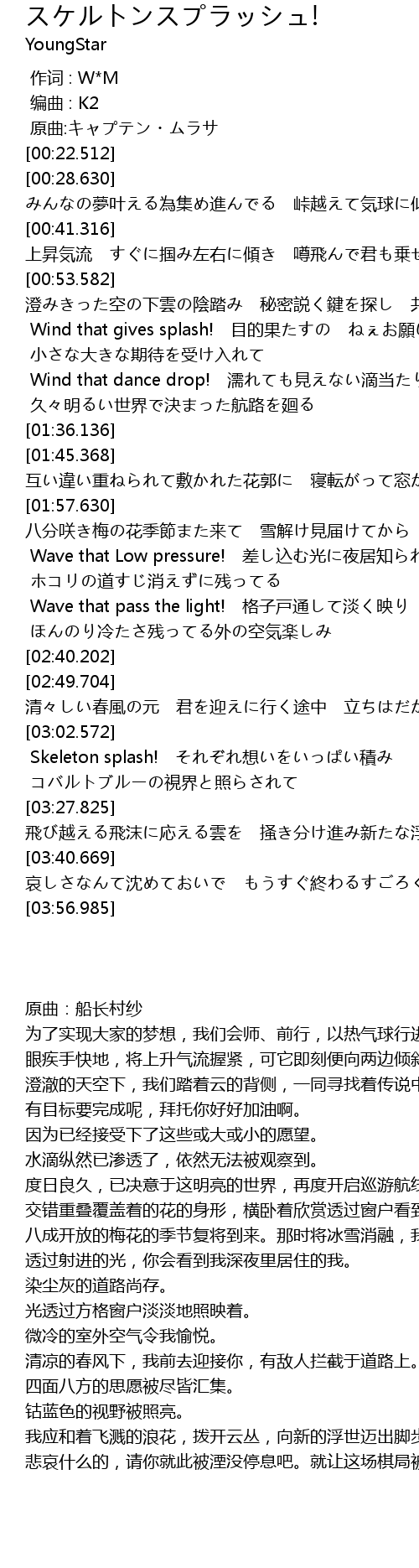 | [03:14.889] | Skeleton splash! それぞれ想いをいっぱい積み |