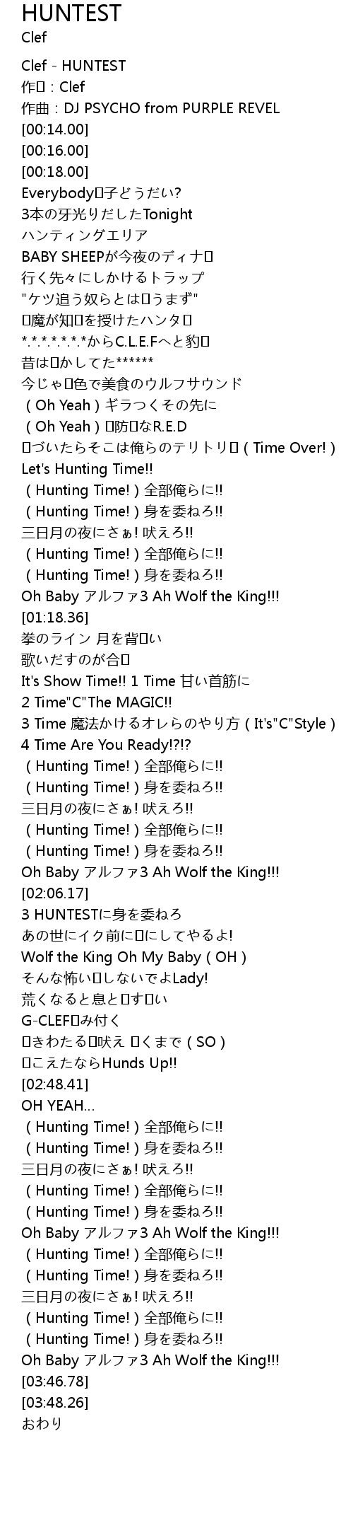 | [03:41.63] | Oh Baby アルファ3 Ah Wolf the King!!! |
