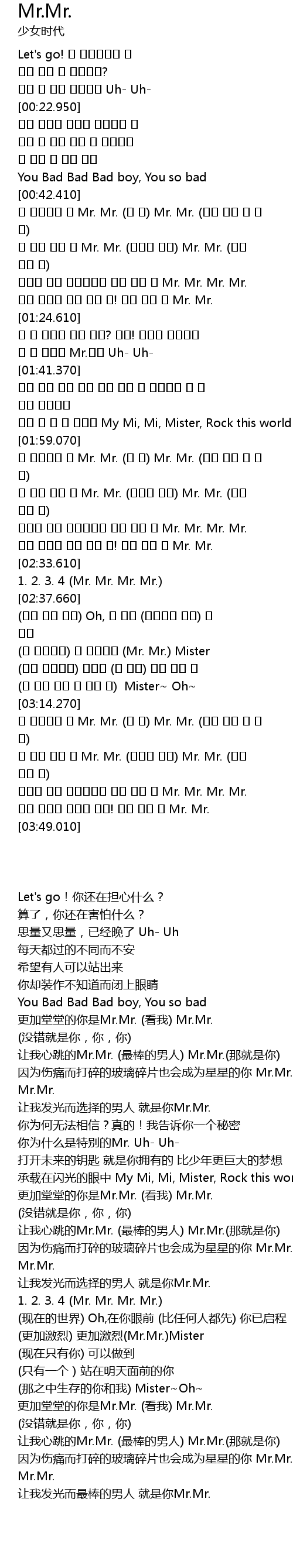 | [03:22.600] | 날 가슴 뛰게 한 Mr. Mr. (최고의 남자) Mr. Mr. (그게 바로 너) |