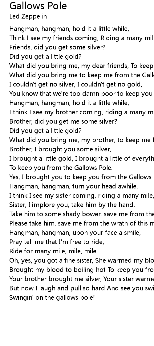 But now I laugh and pull so hard And see you swinging on the Gallows Pole |