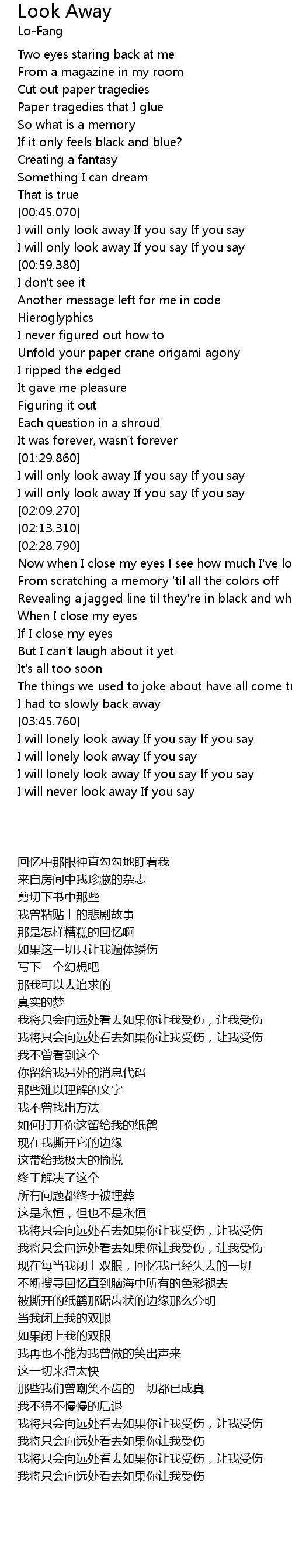 | [00:45.160] | I will only look away If you say If you say |