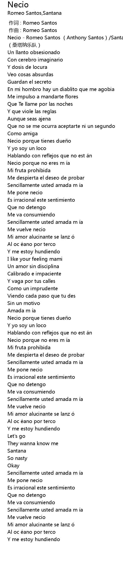 | [00:00.900] | Necio - Romeo Santos (Anthony Santos)/Santana (桑塔纳乐队) |
