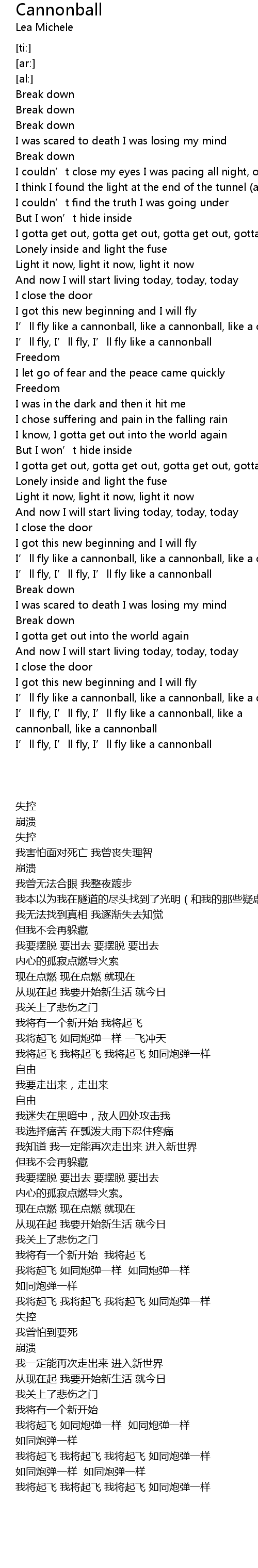 | [03:13.05] | I' ll fly, I' ll fly, I' ll fly like a cannonball, like a cannonball, like a cannonball |