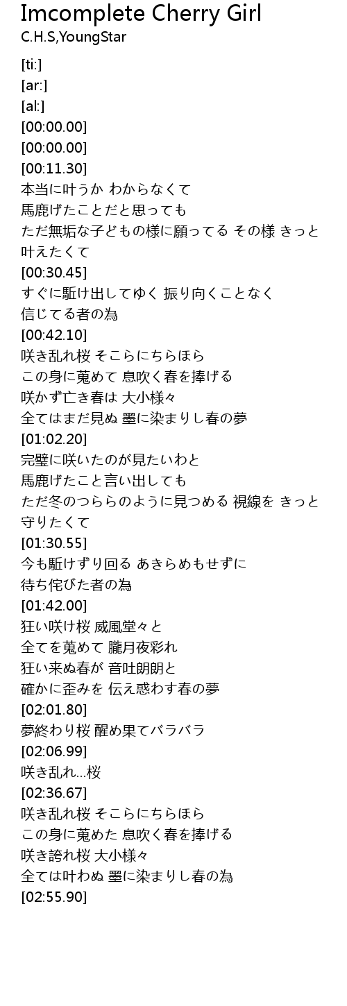 | [02:01.91] | 夢終わり桜 醒め果てバラバラ |