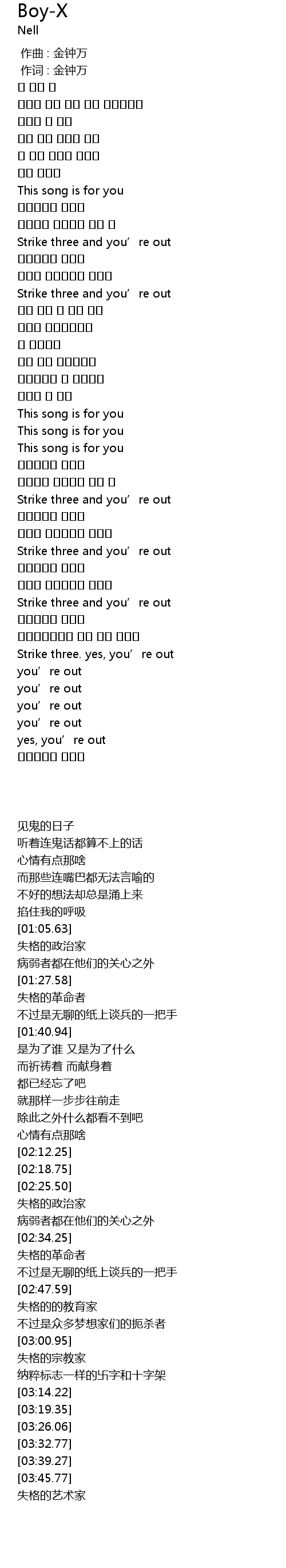 | [03:00.95] | Strike three and you' re out |
