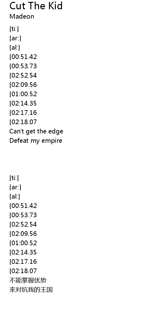 | [03:05.36][02:52.54][02:06.44][00:55.94] | Can't get the E |