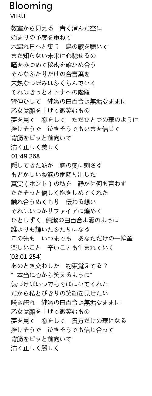 | [01:00.038] | 未熟なつぼみはふくらんでいく |