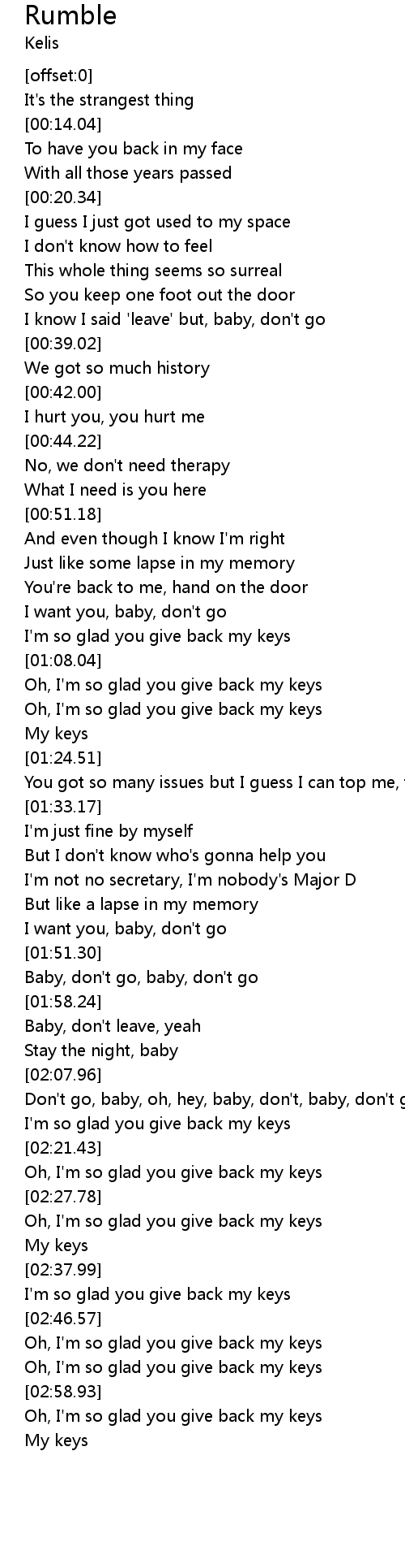 | [01:15.32] | Oh, I'm so glad you give back my keys |