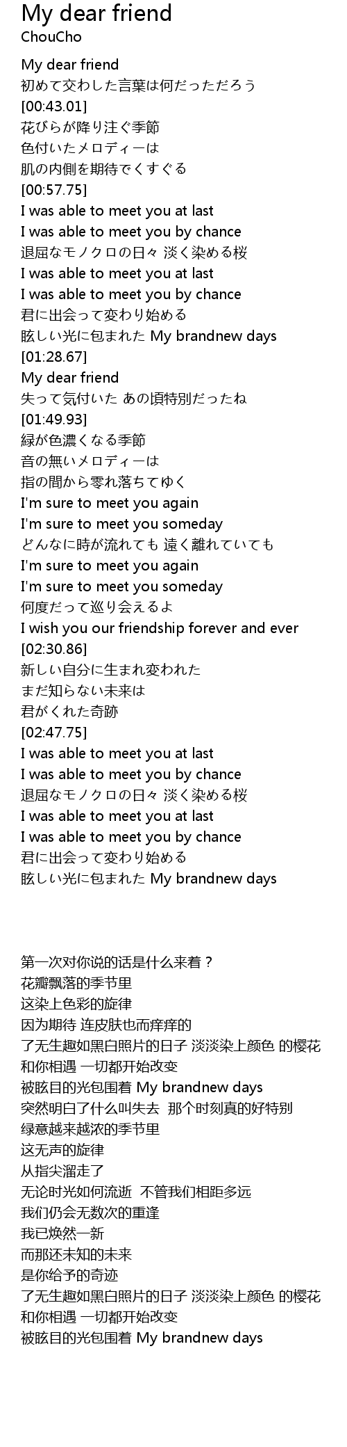 | [01:19.37] | 眩しい光に包まれた My brandnew days |