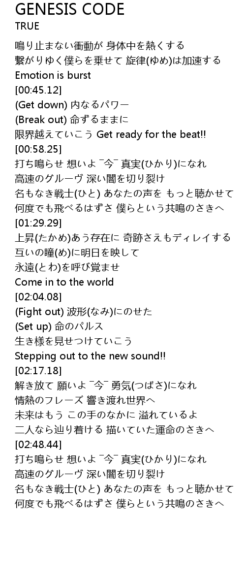 | [03:20.11] | 打ち鳴らせ 想いよ ―今― 真実(ひかり)になれ |
