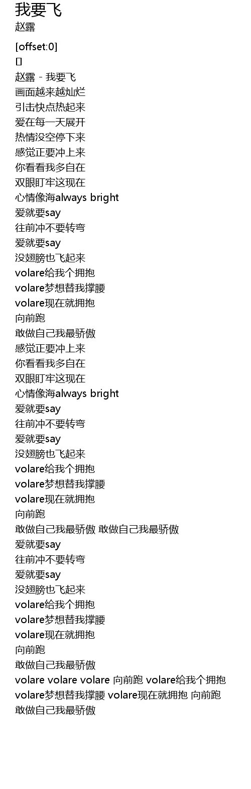 | [02:52.588] | volare volare volare 向前跑 volare给我个拥抱 volare梦想替我撑腰 volare现在就拥抱 向前跑 敢做自己我最骄傲 |
