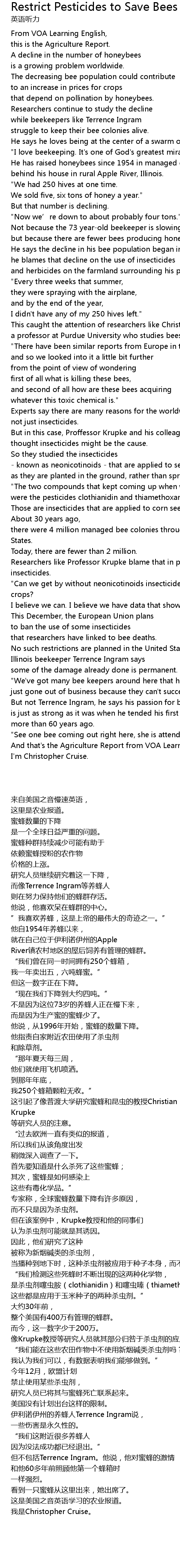 | [01:13.83] | He says the decline in his bee population began in 1996. |