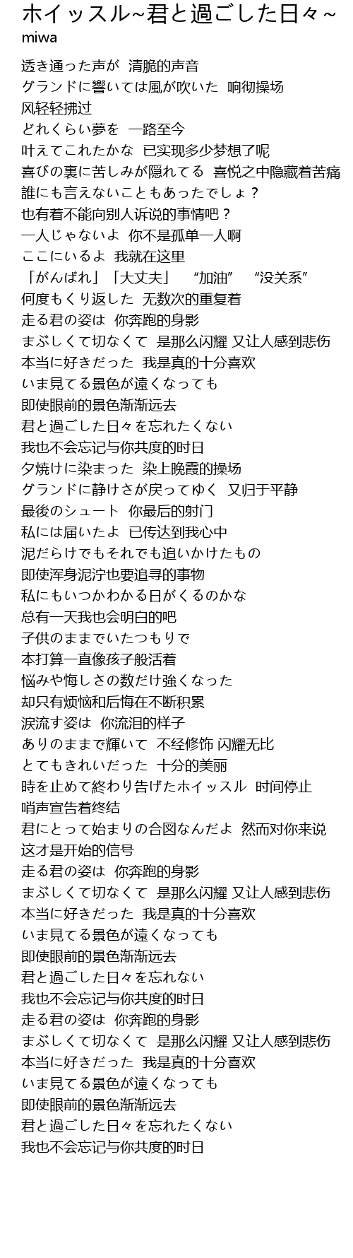 | [02:58.92] | 時を止めて終わり告げたホイッスル 时间停止 哨声宣告着终结 |