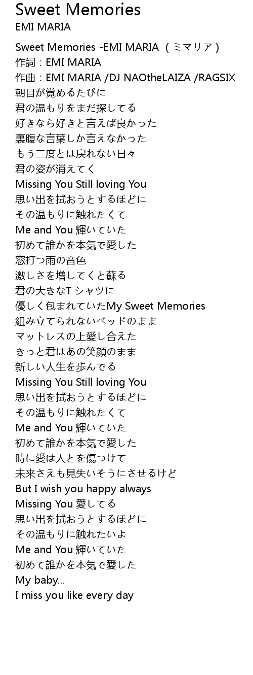 | [00:00.00] | Sweet Memories -EMI MARIA (ミマリア) |