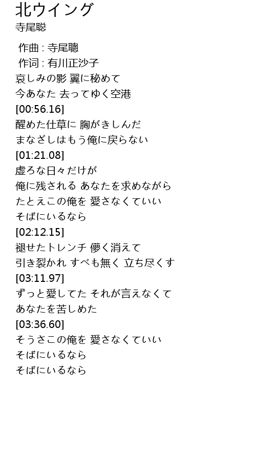 | [00:56.81] | 醒めた仕草に 胸がきしんだ |