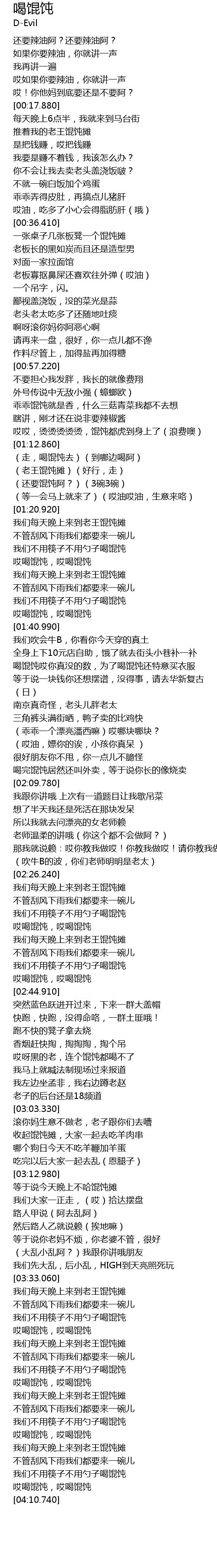 | [02:06.370] | 喝完馄饨居然还叫外卖,等于说你长的像烧卖 |