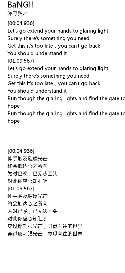 | [02:53.814] | Run though the glaring lights and find the gate to the new world you hope |