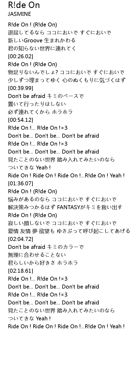 | [02:19.34] | R!de On !... R!de On !×3 |
