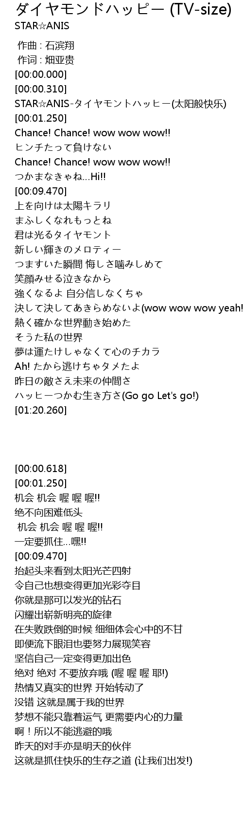 | [00:00.618] | STAR☆ANIS-タイヤモントハッヒー(太阳般快乐) |